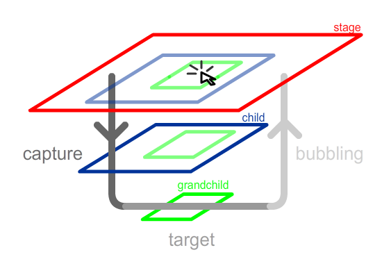 We can visualize the event traveling from the stage down the hierarchy to the target object. This is called the capture phase.