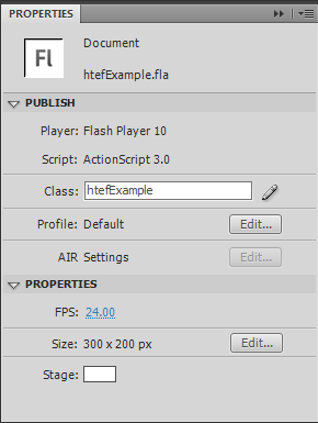 Create a new FLA (here named htefExample.fla) and a new document class ActionScript file (here named htefExample.as).