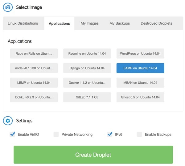 Once you've signed up for Digital Ocean, you'll want to create a droplet: