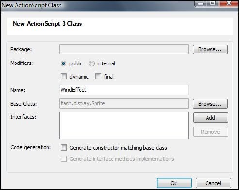 Name the class WindEffect, click the browse button for the base class and enter flash.display.Sprite. Hit OK to complete.