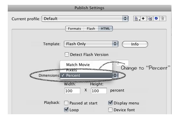 Open website.fla. Go to File > Publish Settings and ensure HTML is enabled. Click the HTML tab and change the dimension to "Percent". Ensure the percent is set to 100 on both width and height.