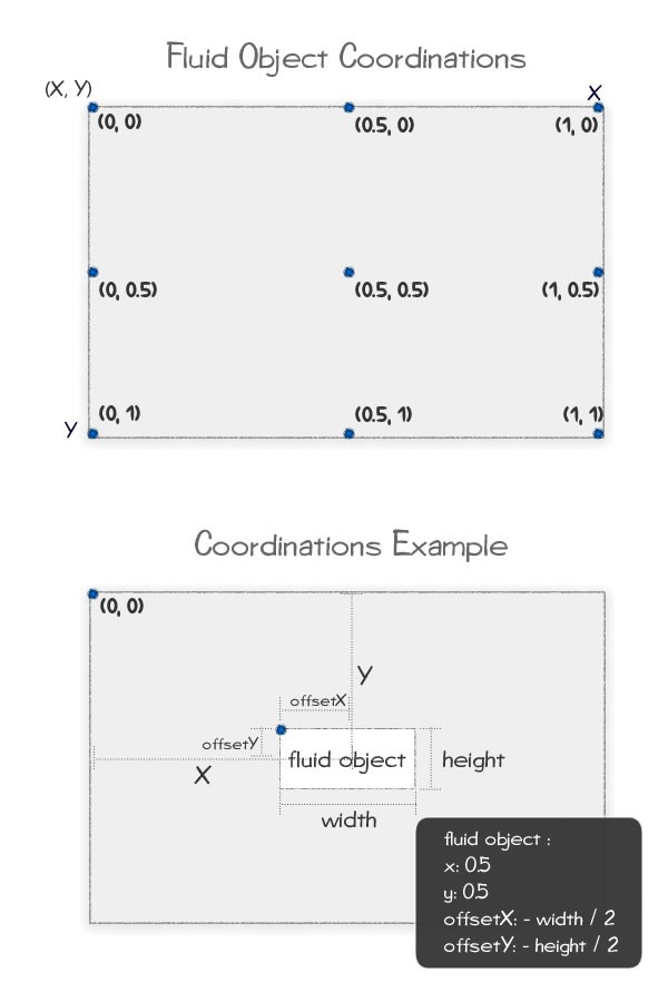 Assigning x and y to 0 will make the fluid object align to the top left corner. Assigning x and y to 1 will make the fluid object align to the bottom right corner. Therefore, assigning x and y value between 0 and 1 will float the object at a percentage of the width and height of the browser.