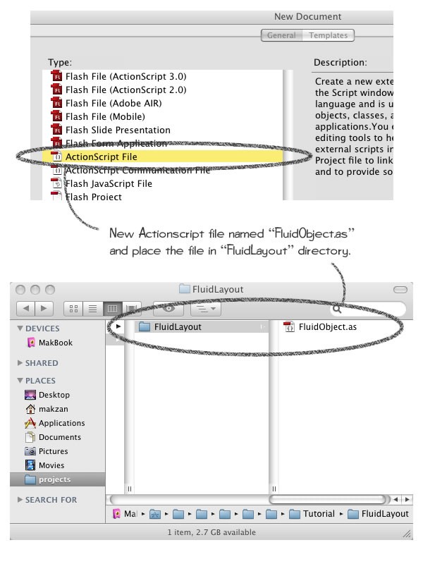 It's a good habit to put the ActionScript class files in directories by category. For example, fluid layout classes will be placed in the "FluidLayout" folder in this case.