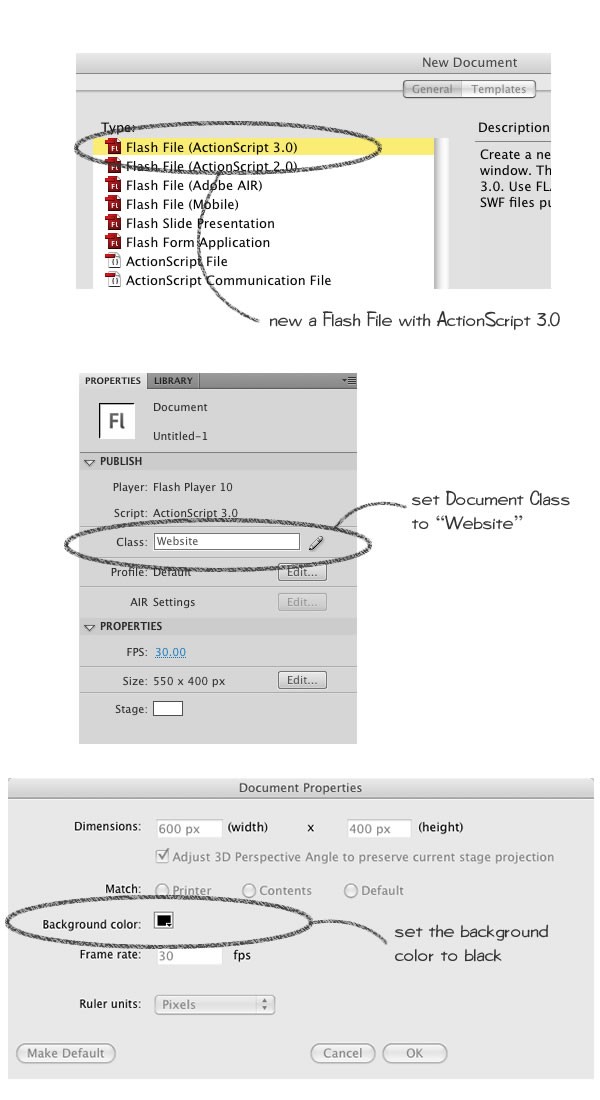 Begin a new Flash Document with ActionScript 3.0 supported and call it "website.fla". Then set the Document class as "Website".