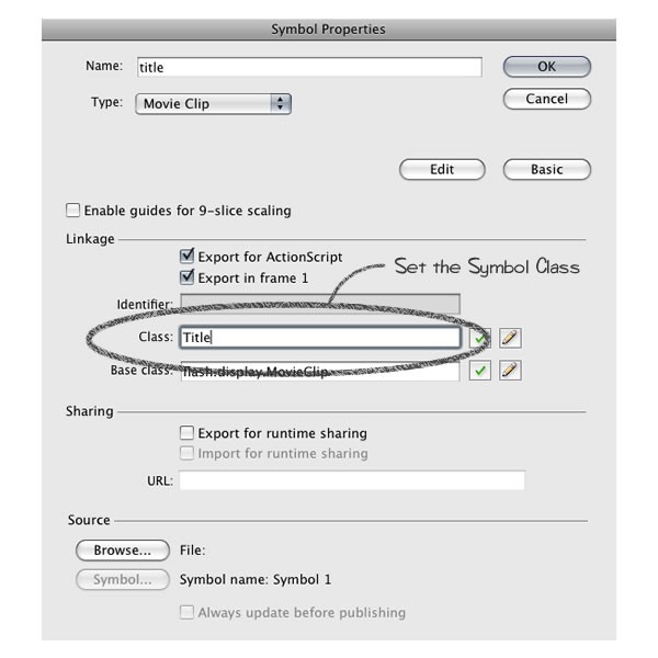 Click "Export for ActionScript" to enable the ActionScript to access this symbol. Then find the "Class" field in the dialog and set the value to "Title" for the title symbol. This means that we've assigned a new Class called "Title" to this symbol. We can use this symbol later in the ActionScript.