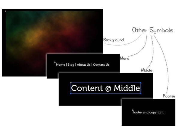 We'll use the same method to draw "background", "menu", "middle content" and "footer". The class name of these symbols will be Background, Menu, Middle and Footer accordingly.