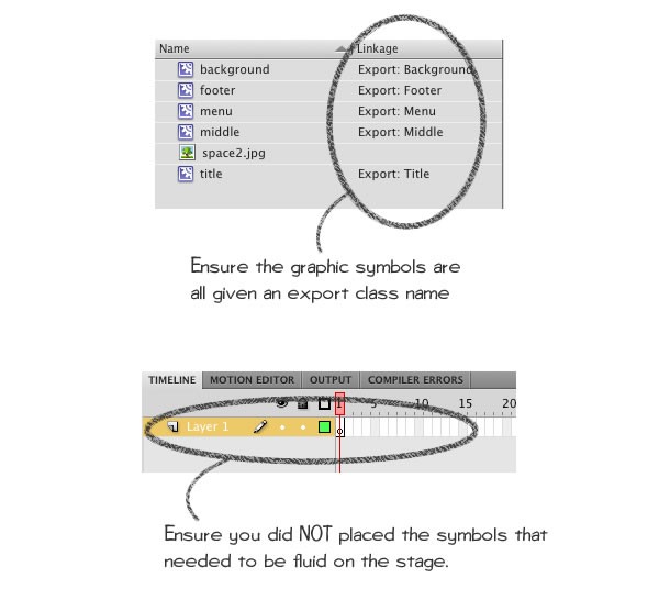 There's no need to place the symbols on the stage because the Website.as will create symbol instances from library by using their class names. The linkage class names of the symbols needs to be correct in order for the script to use them. The linkage class name can be checked in the library panel.