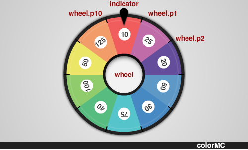 The image above shows the Instance Names of the various MovieClips. Pay special attention to the wheel.p MovieClips; these are the little black lines that divide the colors in the wheel, and are inside the wheel MovieClip. They are named p1 to p10, going clockwise.