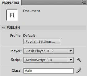 Add the class name, Main, to the Class field in the Publish section of the Properties panel to associate the FLA with the Main document class.