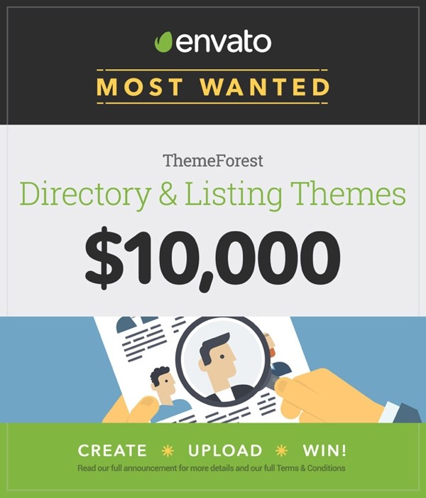 We’ve put a $10,000 bounty on the heads of Envato’s most wanted file type – WordPress Directory & Listing Themes on ThemeForest. How do you collect? We’re running a Best Item Contest (voted by Envato staff). Authors of all WordPress Directory & Listing Themes submitted between May 26th – August 8th.