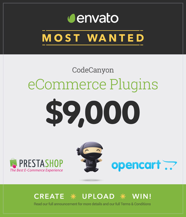 We’ve put $9,000 bounty on the heads of Envato’s most wanted file types – WooCommerce Plugins,OpenCart Extensions and PrestaShop Modules.