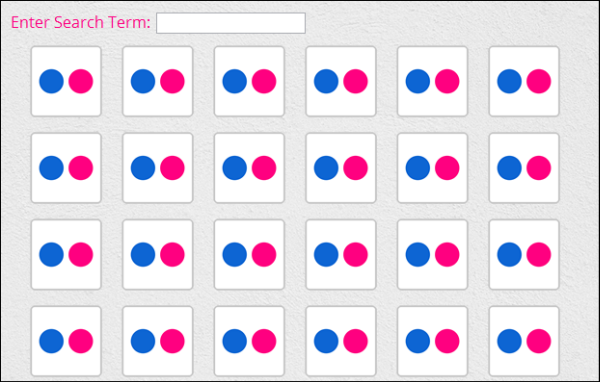 The search input has been sitting there looking pretty, but being totally non-functional all this time. Let's fix that. We will listen for the user to hit the Enter key and then call the doSearch() method using whatever they typed in to call the Flickr API.