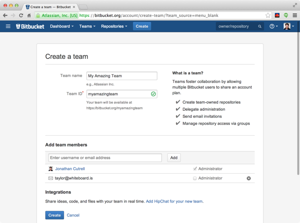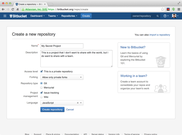 Signing up for Bitbucket is incredibly easy. Head over to the homepage and enter your details. If you need to go ahead and sign up your team, go to this page instead, and choose your plan from the dropdown menu.