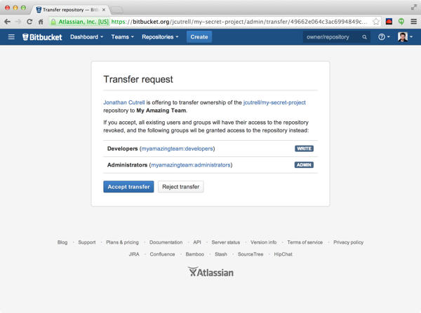 If you are transferring it to a team of which you are an administrator, Bitbucket immediately allows you to accept the transfer. Once that transfer has been made, your team page will now show the repository.