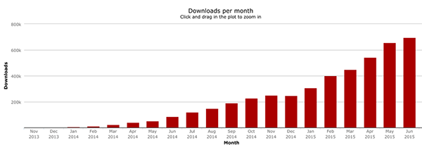 In 2014 there were a little under 1.4 million downloads in total for the year, but from January to June in 2015 there had already been over 3.8 million downloads.