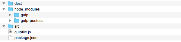 Inside your project folder create two subfolders, one named “src” and one named “dest”. The “src” folder is going to hold your unprocessed CSS files, while the “dest” folder will have your PostCSS processed files written into it.