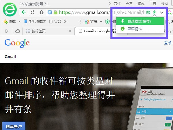 360 Secure integrates both Webkit and Microsoft’s Trident layout engines. By default, pages are loaded on a Webkit-based engine, but at any time, you can open up the little lighting-bolt symbol in the URL bar and choose to load the page in “IE Mode”.