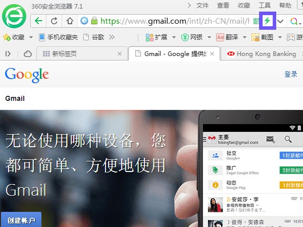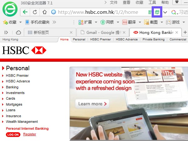 Having heard reports that some users have had issues loading the HSBC Hong Kong portal in browsers other than IE, I popped the page open in 360 Secure, and sure enough, it auto-swiched to IE mode.