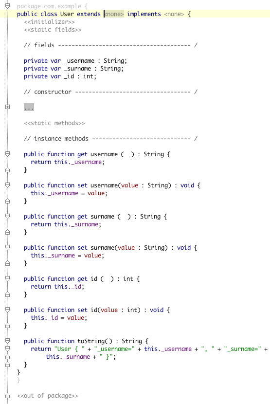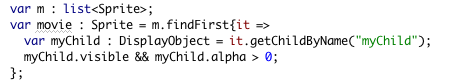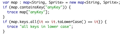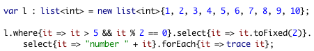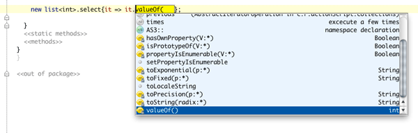 There are also conversion operations that can be utilized to facilitate embedding the new Collections extensions to your actual pure-ActionScript project. Just take a trivial array (or vector) and apply the .toList operation. After processing a list (or a map) you can always convert it back to the old-school AS3 style using .toArray or .toVector.