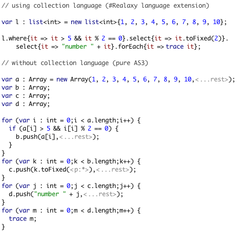 Well, let's introduce the Collections AS3 language extension that is available in RASE Beta 10, build 8177+.