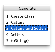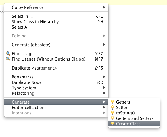 Now we need to create three classes to store the data structure: User, TwitterAccount and Message. We can do it from the Generate menu, which is available through right-clicking the code or pressing Ctrl+N.