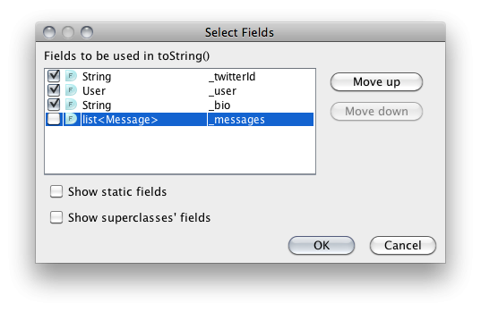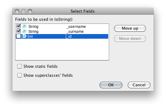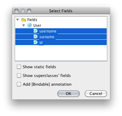 Don't forget to add a text presentation to the User class. Add .toString() method — item 5 from the Ctrl-N menu (same as on screenshot to Step 2 and 6).