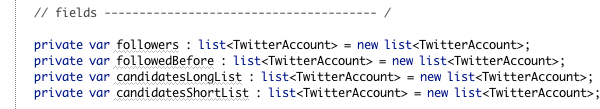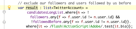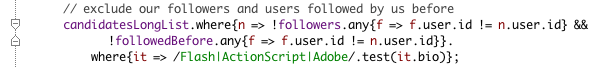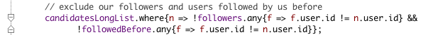 Let's return to our unfinished closure. Add some code that will implement our "rules". This code will return a cut-down version of candidatesLongList that doesn't include any of our followers: