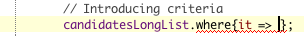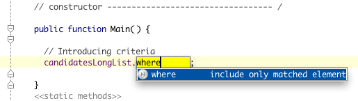 Jump to Main() constructor, and enter the candidatesLongList with its method “where” (hit Ctrl-Space to use autocompletion like in the screenshot below):