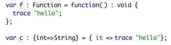 Unlike an anonymous function (and also as a counter to the aforementioned Arrays and Vectors), a closure is type safe. That means that autocomplete and type-checking will work in closures.