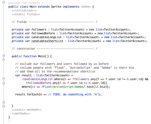 We'll not turn our attention to interacting with Twitter API, since our goal is only to show how to get started with the Collections language and to show advantages of a functional approach in working with collections in AS3.
