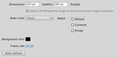 Launch Flash and create a new Flash Document, set the stage size to 320x280px and the frame rate to 24fps.