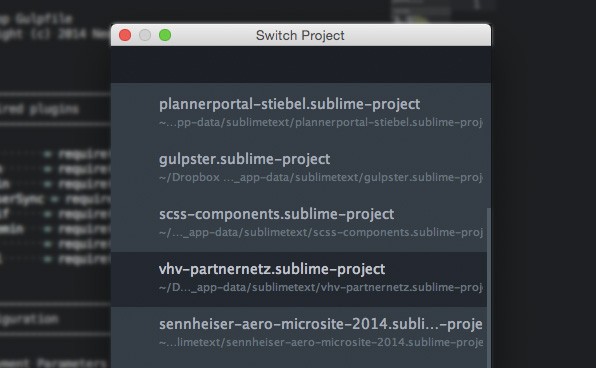 To quickly access a list of all previous projects use the shortcut CMD-CTRL-P. Type in a search query to filter the list, press enter and you’ll immediately open the folders and files of that project in the sidebar.
