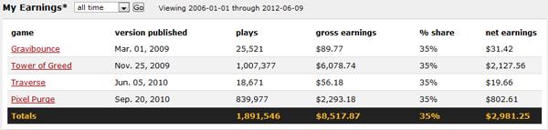 It gets better; if you implement their “Statistics & Challenges API”, you'll receive an additional 10%! Finally, if your game is exclusive to Kongregate, or sponsored by them, you receive an additional 15%. This gives you the opportunity to earn up to 50% of the ad revenue for your game on Kongregate. If you're wondering how much that is, check out some of my personal stats: