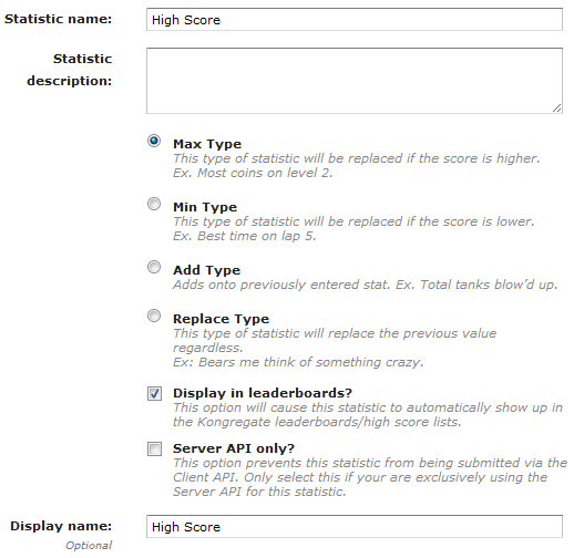 Knowing which of the above types you need to use for each of your game stats is extremely important, so make sure you familiarize yourself with the above list. You'll obviously want a list of stats that you want your game to send to Kongregate, so make sure that you have those prepared before you dive into the next step when actually submitting a game.