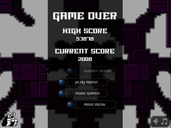 Assuming that players actually have fun with the game the way it is (admittedly doubtful beyond the first play or two), we still have some fixing up to do. When the player dies, they aren't really left with any incentive to play again. The game over screen should be used as an opportunity to tempt the player to play again - and simply having a button to let them do so is not what I mean.