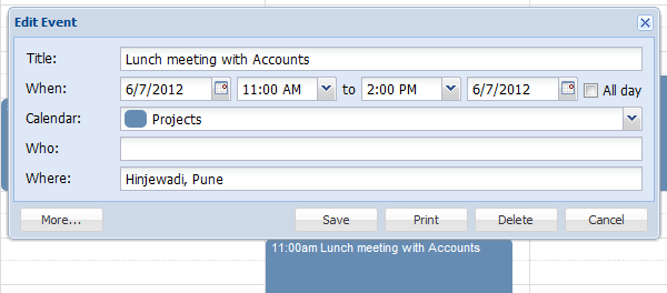 What I sorely missed right away was a way to quickly add events to the calendar using a text field and natural language parsing. The only way to add an event is to click the right location on the calendar and add the necessary details in the box. To its credit, Teamup makes the event entry box much clearer than Google's version. Inside is the same old "what, when, who, where" routine. There is a "More..." in this box that I expected would give finer control over the event details; instead it just opens up a text area to add notes for your event. So basically the "More..." button opens up a "Notes" section.