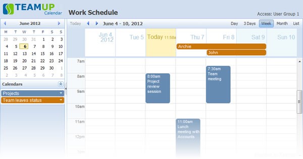Teamup takes a very different approach to most other collaboration apps out there. There is no registration involved, so pretty much anyone can join in almost seamlessly. Remember how I mentioned about the two links you get when you create a calendar? Turns out, everyone with access to those links can collaborate on a calendar either as an administrator or a regular user. Admins have the ability to add or remove calendars, change display settings and create or edit user groups with specific access restrictions. Users, on the other hand, can only view events, or add/edit them based on what privileges have been assigned to the URL they have.