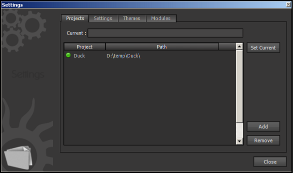 Start the ShiVa Editor. From the top bar menu, select Main -> Projects -> Add. Enter a folder path to store your game. (We chose D:\temp\Duck.)