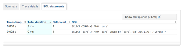 Let's dig into the trace a little bit. It looks like the SQL SELECT was fast, a Car.find was also fast. Then we lose about 2 seconds which is followed by some very fast template rendering: