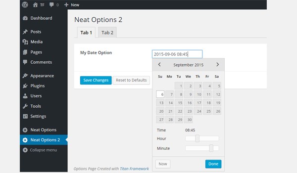 You can see that the option named My Date Option exists inside an admin panel Neat Options. The default date setting also appears in the above screenshot.