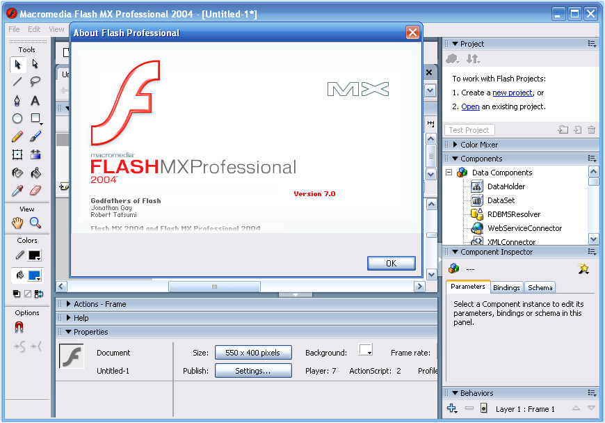 | Macromedia Flash MX 2004(7) | 2003 | Released with Flash Player 7, new features included: Actionscript 2.0 (which enabled an object-oriented programming model for Flash, although it lacked the Script assist function of other versions, meaning Actionscript could only be typed out manually), behaviors, extensibility layer (JSAPI), alias text support, timeline effects. Macromedia Flash MX Professional 2004 included all Flash MX 2004 features, plus: Screens (forms for non-linear state-based development and slides for organizing content in a linear slide format like PowerPoint), web services integration, video import wizard, Media Playback components (which encapsulate a complete MP3 and/or FLV player in a component that may be placed in an SWF), Data components (DataSet, XMLConnector, WebServicesConnector, XUpdateResolver, etc.) and data binding APIs, the Project Panel, v2 UI components, and Transition class libraries. |