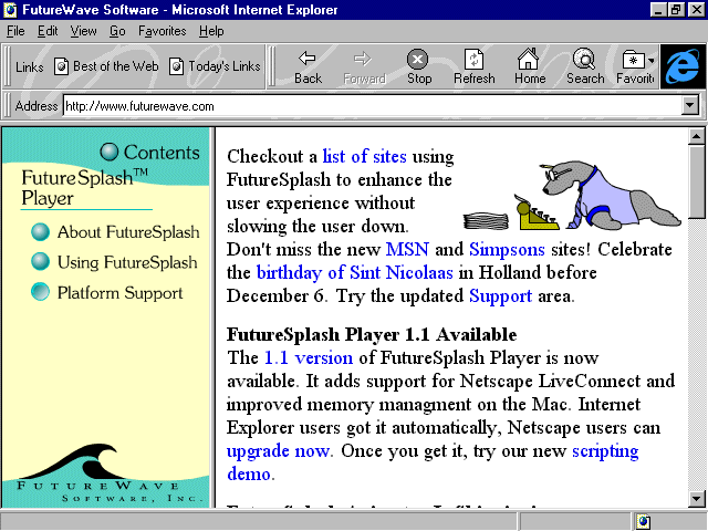 Their big success came in August of 1996. Microsoft was working on MSN and wanted to create the most TV-like experience on the Internet. They became big fans of FutureSplash and adopted the technology. Their other high-profile client was Disney Online. They were using FutureSplash to build animation and the user interface for the Disney Daily Blast. Disney was also working with Macromedia Shockwave.