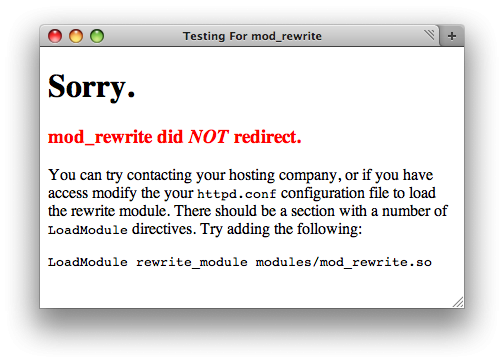 Just like enabling .htaccess support, enabling mod_rewrite or any Apache module must be done from the global configuration file (httpd.conf). Just as before, since mod_rewrite usage is so widespread, hosting companies almost always have it enabled. However, if you suspect that your hosting company does not - and we will test for that below - contact them and they will likely enable it.