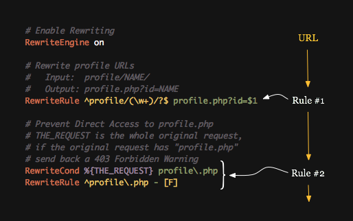 After making it through the first rule, the URL has changed. The total URL has been rewritten to profile.php?id=joe, which Apache then breaks down and updates many of its variables. The ?id=joe portion gets hidden from us and profile.php, the new “URL Part”, continues into the second rule. This is our first encounter with conditions: