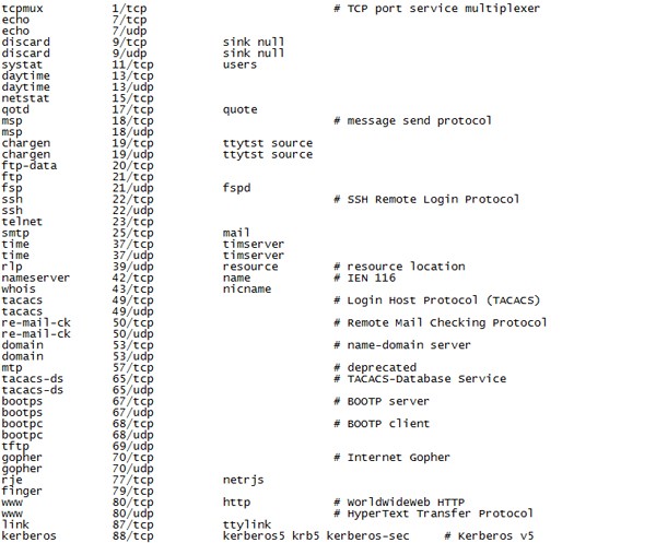 Below is a screenshot showing a part of the file. As you can see, services are listed in the first column, followed by the port number to be accessed at and the protocol name the service uses.
