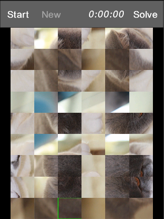 Once all the pieces have taken their random positions, the Start and Solve buttons become enabled in the toolbar at the top as shown in the figure below. There are a total of 54 puzzle pieces placed in 9 rows and 6 columns. As we will see later, the application code can be easily extended to accommodate any number of rows and columns. The purpose of the game is to position the pieces to construct the puzzle image correctly in the shortest timeframe possible. If a piece is positioned in the correct location, its borders are highlighted in green. As an example, see the third piece in the last row below.