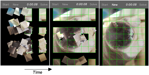 The main goal of the Puzzle is very simple. When the game starts, pieces of an image are randomly positioned on the screen. To solve the puzzle, the user needs to place those pieces in their correct locations. A timer shows the elapsed time since the start of the game. The timer can be paused if the user needs time off from the game. By pressing a "Solve" button, the game can be automatically solved, a feature that comes in handy if the user needs help with solving the game.