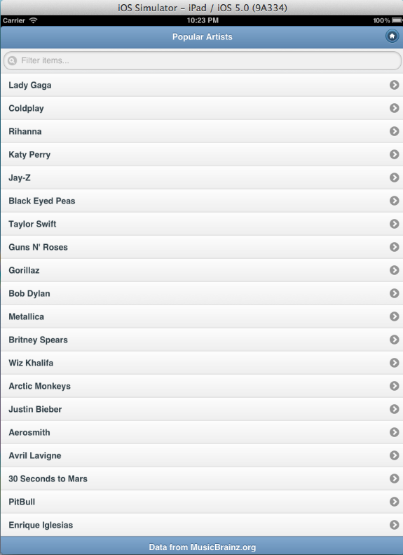 Run the index.php from your CLI, it should generate 20 HTML files with the format ARTIST-ID.html within the Data folder. Copy these 20 files over to your data folder in your Xcode project from Step 1. Now, run your Xcode project and click on an artist to navigate to its details page. You should see the following result for the iPad: