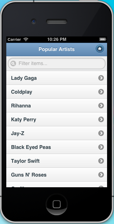Now, let's add an index.html to this data folder so we have a strarting point for our magazine app. We use jQuery Mobile's default design here and show a searchable list of Popular Artists. In the index.html file, add the following code, along with the jQuery Mobile framework and jQuery javascript library.