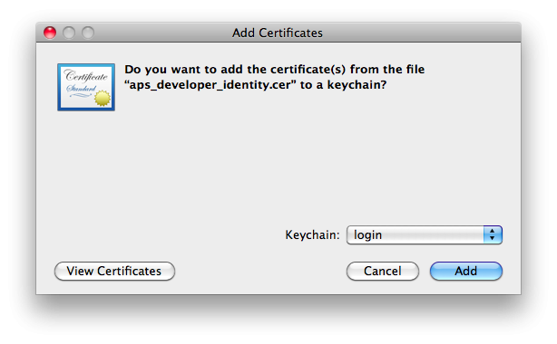 The first thing you need to do, if you haven't done it already, is to double-click the downloaded certificate (it should be named aps_developer_identity.cer) in the Finder and click "Add" to add it to your keychain. Note: You need to add the certificate to the same keychain that contains the public and private keys generated by the certificate signing request in the previous installment.